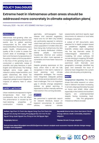 Vietnamese fast-growing cities are increasingly affected by extreme heat events due to global warming compounded by the urban heat island (UHI) effect. This trend threatens public health, infrastructure, and quality of life. In order to assess the current state of knowledge in Viet Nam and the level of preparedness of the policy-makers and the population in the face of this growing issue, we conducted a systematic review of scientific and grey literature, in both English and Vietnamese. The finding shigh light some major gaps inresearch, policy implementation, and public awareness. We stress theurgent need to enhance Viet Nam’s capacity to adapt to and mitigate the impacts of extreme heat in urban areas.