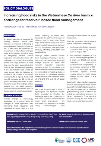 hydrological and hydraulic modeling. Results show large increases in flood flow over the basin, especially in the main Ca River and Hieu River. Flooding in the downstream area would be more severe, with for instance an increase in the number of inundated communes for a typical flood event from 119 currently to 125 at 3°C of global warming compared to preindustrial levels. The findings further suggest that the flood regulation capacity of major reservoirs, such as Ban Ve reservoir, would be exceeded.
