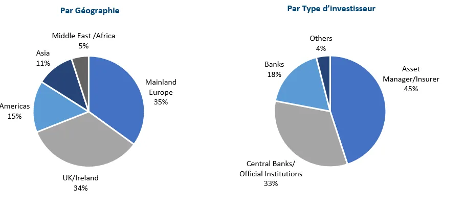 La qualité de la demande se reflète dans la typologie des investisseurs alloués. Les gestionnaires d’actifs et assureurs ont été alloués à 45% de la taille finale, les banques centrales & institutions officielles à 33%, les banques à 18% et 4% ont été alloués à d’autres investisseurs. En termes de géographies, Les comptes d’Europe continentale représentaient 35% des allocations, suivis par les investisseurs Britanniques & Irlandais pour 34%, les Amériques pour 15%, l’Asie pour 11% et le Moyen-Orient/Afrique pour 5%.