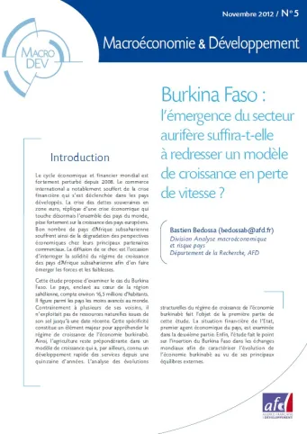 La crise financière de 2008 a fortement dégradé les perspectives économiques des principaux partenaires commerciaux de nombreux pays d‘Afrique subsaharienne. La diffusion de ce choc est l’occasion d‘interroger la solidité du régime de croissance des pays d‘Afrique subsaharienne afin d‘en faire émerger les forces et les faiblesses. Cette étude propose d‘examiner le cas du Burkina Faso. L’analyse des évolutions structurelles du régime de croissance de l’économie burkinabè fait l’objet de la première partie de cette étude. La situation financière de l’Etat, premier agent économique du pays, est examinée dans la deuxième partie. Enfin, l’étude fait le point sur l’insertion du Burkina Faso dans les échanges mondiaux afin de caractériser l’évolution de l’économie burkinabè au vu des ses principaux équilibres externes,