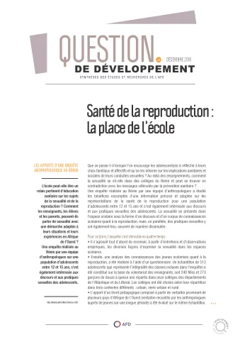 L’école peut-elle être un relais pertinent d‘éducation sanitaire sur les sujets de la sexualité et de la reproduction ? Comment les enseignants, les élèves et les parents, peuvent-ils parler de sexualité avec une démarche adaptée à leurs situations et leurs expériences en Afrique de l’Ouest ? Une enquête réalisée au Bénin par une équipe d‘anthropologues sur une population d‘adolescents entre 12 et 15 ans, s‘est également intéressée aux discours et aux pratiques sexuelles des adolescents.